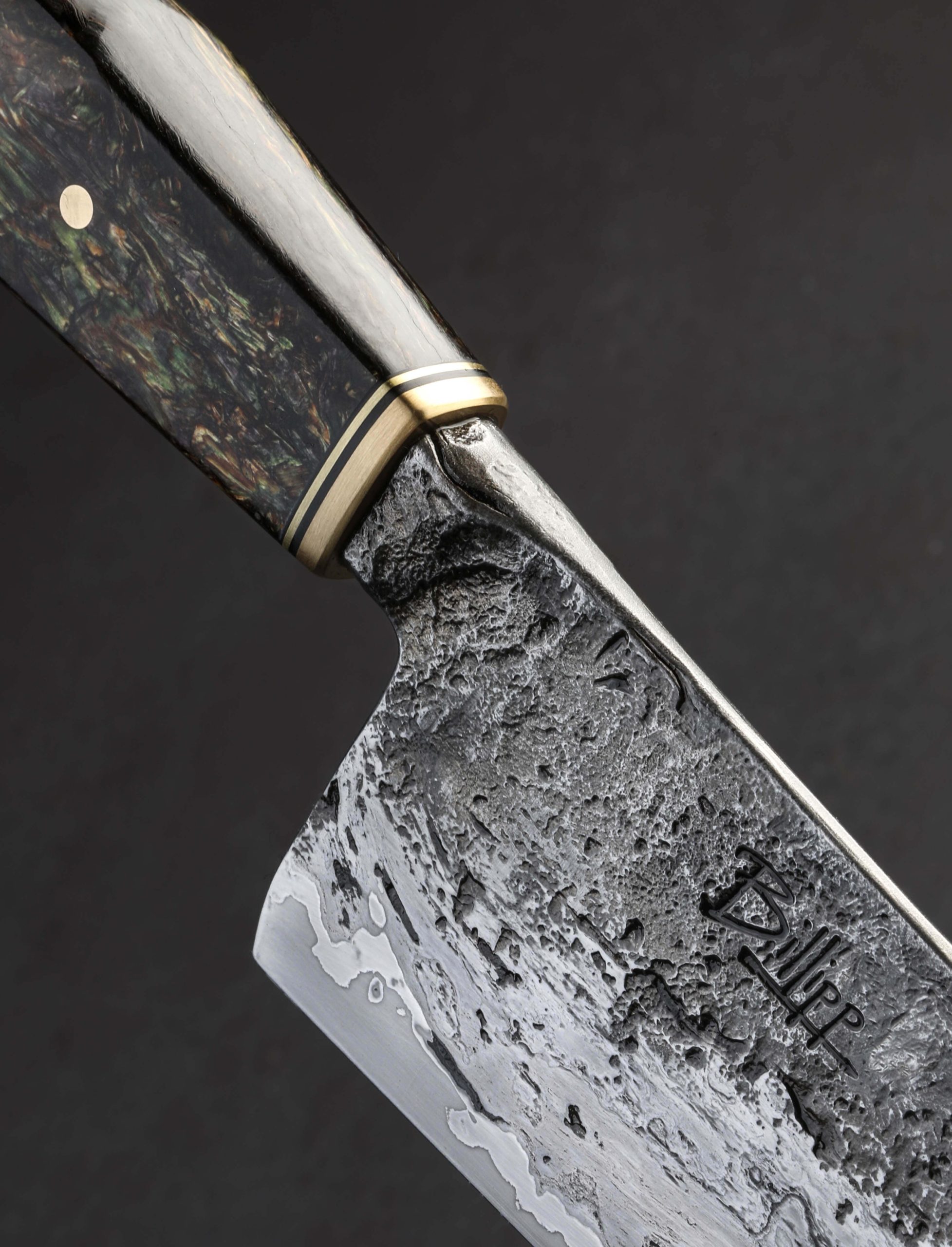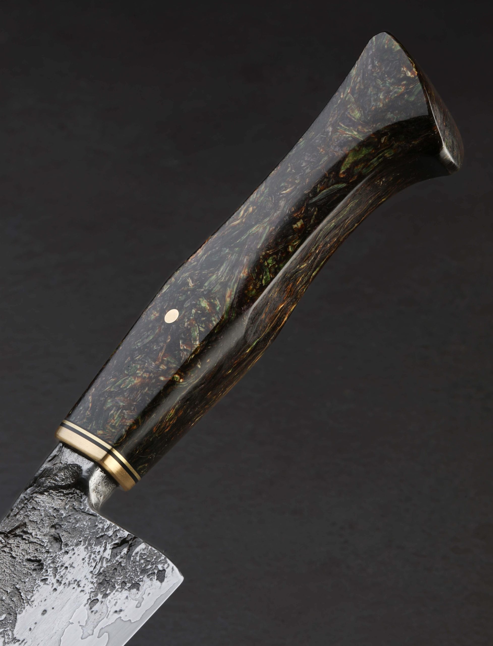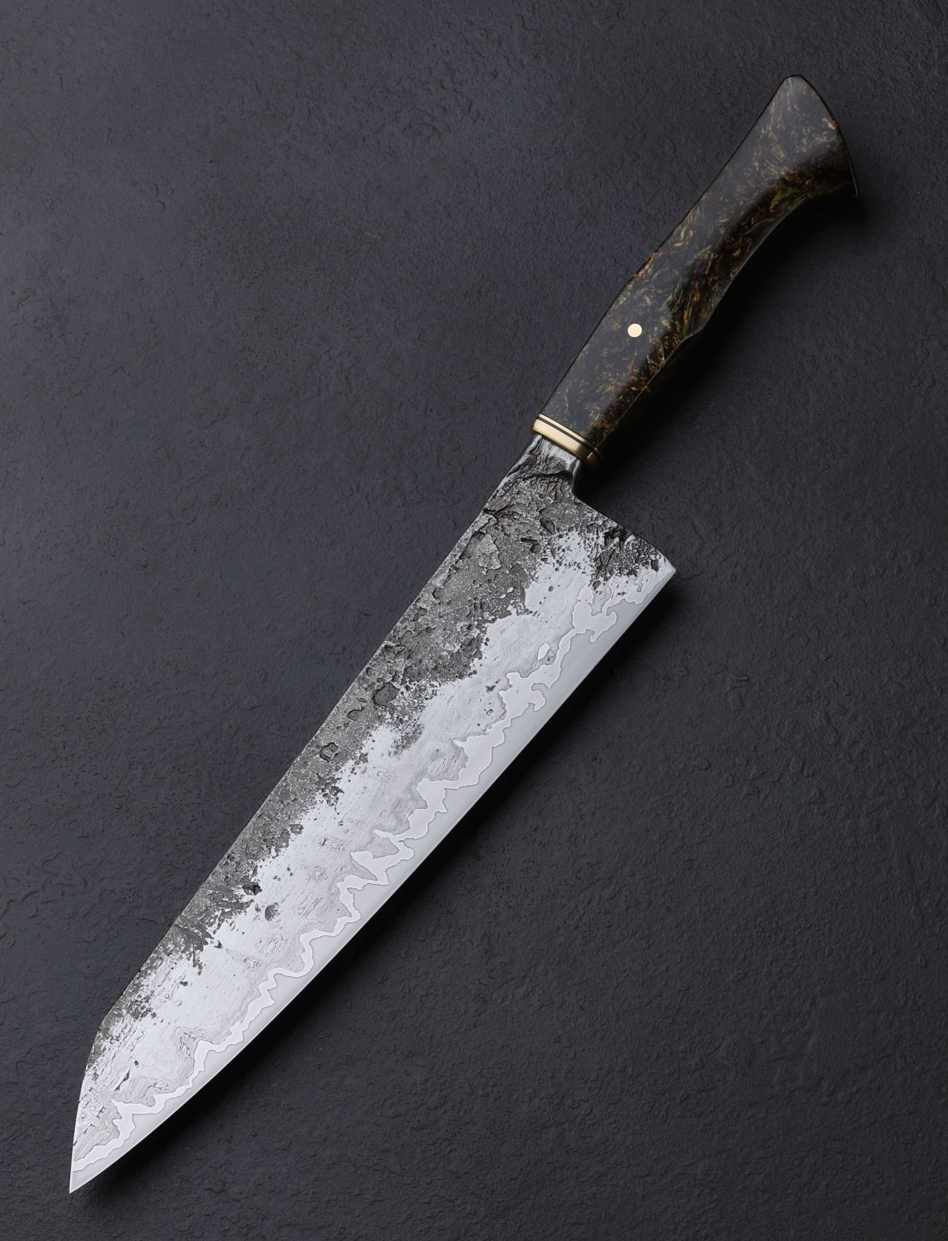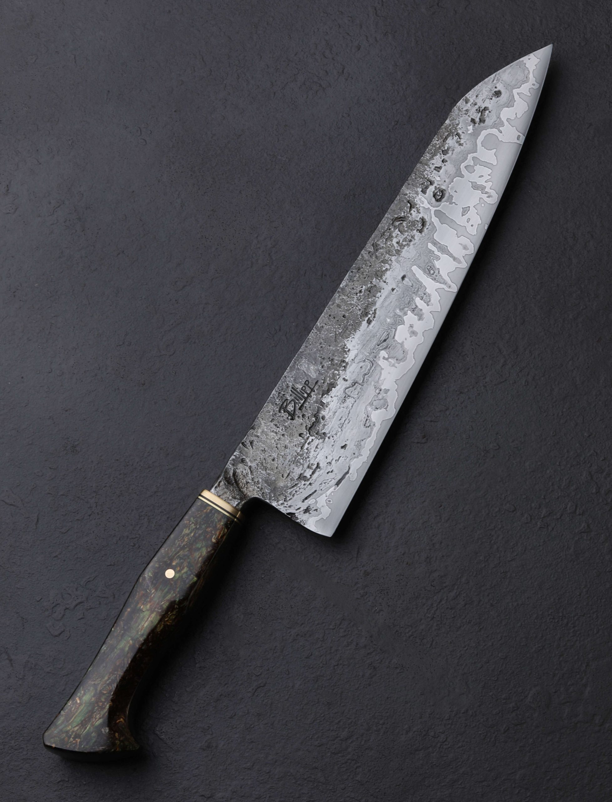 A wagon wheel, reclaimed from its resting place of over a century on the property of the knife’s maker, likely crafted at a small shop in pre-industrial 1800’s New England, provides the beautiful, weathered wrought iron that forms the blade’s cladding on this one-of-a-kind Andy Billipp gyuto. The natural character of the wrought iron is complemented along the blade’s flats and sub-integral bolster by the hand-hewn, rustic appearance of Andy’s forging. Between the wrought iron jackets and hard, razor-sharp 52100 carbon steel edge are layers of nickel-rich 15n20 high-carbon steel to help ensure that the core’s carbon content does not seep out into the wrought iron during forging and heat treatment. The result is not only functional, but beautiful, offering contrasting textures and sheens throughout the height of the blade’s bevels. And as expected of Andy, these materials have been shaped and honed for uncompromising cutting performance. The primary bevel geometry is convex and absolutely superb from heel to tip, slimming downward to a thin, hard edge, the material just above becoming more and more refined the further from the handle, reaching a paper-thin, needle-like tip at the end. At 11.2oz / 318g overall, the knife is not particularly light, its center of mass lying just under an inch in front of the 58mm heel resulting in a wonderfully balanced, steady, and powerful feel in the hand. For comfort and control, the storied wrought begins the handle-portion of this work of culinary art, the sub-integral bolster giving the fingers a soft, sloping surface to hold in the pinch grip. Then, with a handsome marriage of rustic and refined finishes, the wrought iron disappears into a handle capped with polished brass and a thin ring of black. Secured with a single, flush, brass pin, the predominant material with which to wield the knife is a piece of HempWood, an eco-friendly, small-batch hemp wood composite which Andy has sculpted into his recognizable Western form. No details is overlooked. No cut too large.