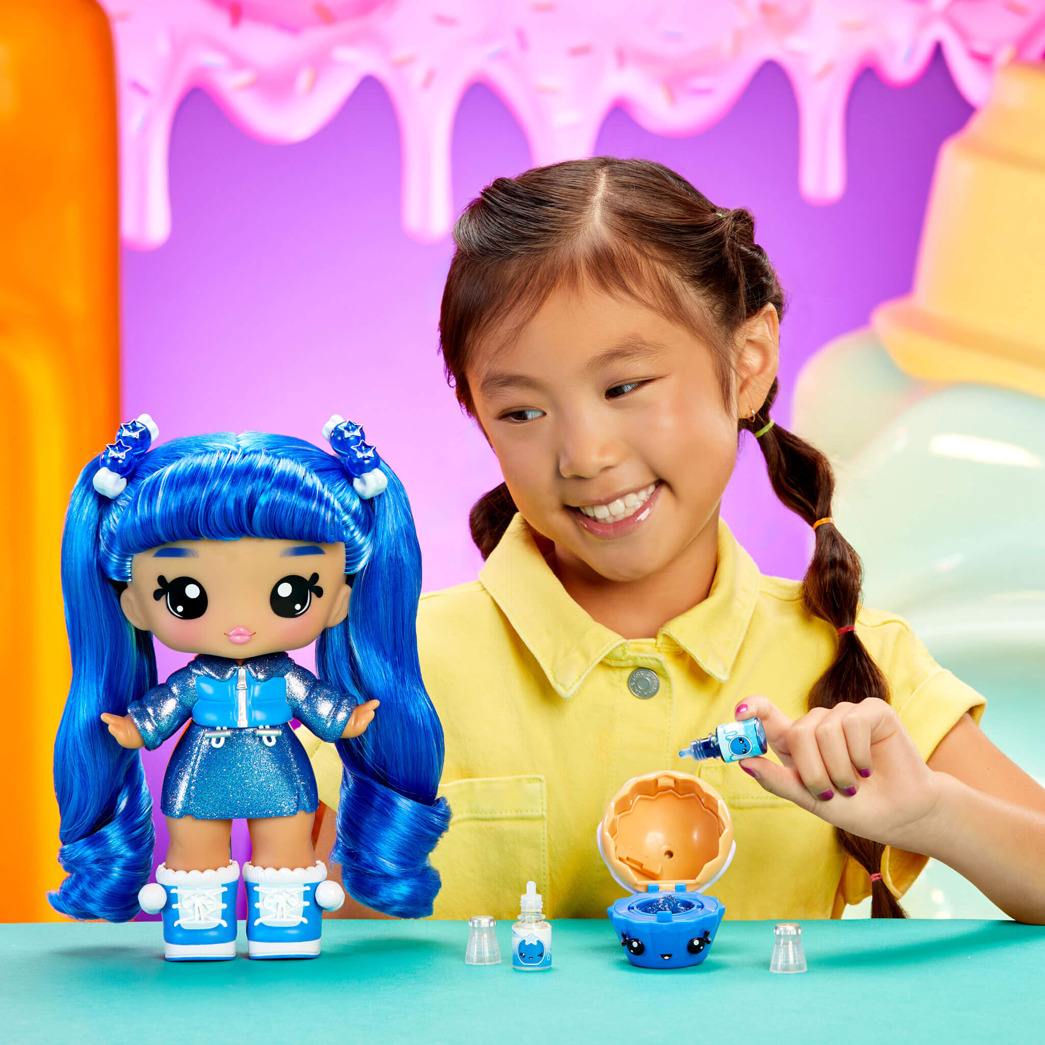 Welcome to Yummiland, where our brave Yummis team up to protect their incredible, edible city with magical lip gloss superpowers! Join them on their journey by creating your own real lip gloss included with your Yummiland doll and Num Nom pet. Each doll also features removable fashion, accessories, and a matching comb for styling their hair!
