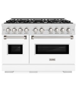 Luxury isn’t meant to be desired – it’s meant to be attainable. The ZLINE 48 in. 6.7 cu. ft. Classic Double Oven Gas Range with 8 Burner Cooktop in DuraSnow® Stainless Steel with White Matte Doors (CGRS-WM-48) combines the elegance of a hand-finished porcelain gas cooktop with 8 Italian-made auto-reignition burners, a large gas convection oven with an energy-efficient cooling fan to ensure quiet operation, a small baking oven, and beautiful white matte doors with Landscape window designs allowing you to master every meal. With a modern, timeless style and refined functionality, ZLINE Classic Gas Ranges are masterfully crafted to deliver an elevated culinary experience.