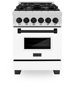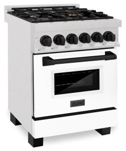 Luxury isn’t meant to be desired – it’s meant to be attainable. The ZLINE Autograph Edition 24 in. 2.8 cu. ft. Legacy Dual Fuel Range with 4 Burner Gas Cooktop and Electric Convection Oven in DuraSnow® Stainless Steel with White Matte Door and Matte Black Accents (RASZ-WM-24-MB) pairs a powerful gas cooktop with 4 Italian-crafted burners, an electric convection oven, a beautiful white matte door with a Landscape window design, and elegant matte black knobs and handle. With innovative features designed to enhance your kitchen’s capability, ZLINE Legacy Dual Fuel Ranges provide a professional culinary experience by pairing unmatched performance with timeless style.