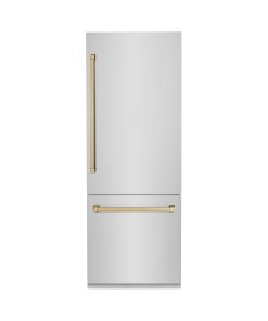 Luxury isn’t meant to be desired – it’s meant to be attainable. The ZLINE Autograph Edition 30 in. 16.1 cu. ft. Built-In Bottom Freezer Refrigerator with Water Dispenser and Ice Maker in Stainless Steel with Champagne Bronze Accents (RBIVZ-304-30-CB) provides the ultimate upgrade to the center of your home by pairing premium dual cooling technology with enhanced storage capacity for multiple grocery items. Achieve ZLINE Attainable Luxury® excellence with innovative features designed to enhance your kitchen’s cooling and freezing capability.