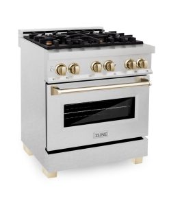 Luxury isn’t meant to be desired – it’s meant to be attainable. The ZLINE Autograph Edition 30 in. 4.0 cu. ft. Legacy Dual Fuel Range with 4 Burner Gas Cooktop and Electric Convection Oven in DuraSnow® Stainless Steel and Polished Gold Accents (RASZ-SN-30-G) pairs a powerful gas cooktop with 4 Italian-crafted burners, an electric convection oven with a Landscape oven door window design, and elegant polished gold knobs and handle. With innovative features designed to enhance your kitchen’s capability, ZLINE Legacy Dual Fuel Ranges provide a professional culinary experience by pairing unmatched performance with timeless style.