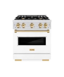 Luxury isn’t meant to be desired – it’s meant to be attainable. The ZLINE Autograph Edition 30 in. 4.2 cu. ft. Classic Dual Fuel Range with 4 Burner Gas Cooktop and Electric Convection Oven in DuraSnow® Stainless Steel with White Matte Door and Polished Gold Accents (CDRSZ-WM-30-G) combines the elegance of a hand-finished porcelain gas cooktop with 4 Italian-made auto-reignition burners, an electric convection oven with an energy-efficient cooling fan to ensure quiet operation, a beautiful white matte door with a Landscape window design, and stunning polished gold knobs and handle allowing you to master every meal. With a modern, timeless style and refined functionality, ZLINE Classic Dual Fuel Ranges are masterfully crafted to deliver an elevated culinary experience.