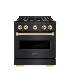 Luxury isn’t meant to be desired – it’s meant to be attainable. The ZLINE Autograph Edition 30 in. 4.2 cu. ft. Classic Gas Range with 4 Burner Cooktop and Convection Gas Oven in Black Stainless Steel and Polished Gold Accents (CGRBZ-30-G) combines the elegance of a hand-finished porcelain gas cooktop with 4 Italian-made auto-reignition burners, a gas convection oven with an energy-efficient cooling fan to ensure quiet operation, a Landscape oven door window design, and stunning polished gold knobs and handle allowing you to master every meal. With a modern, timeless style and refined functionality, ZLINE Classic Gas Ranges are masterfully crafted to deliver an elevated culinary experience.