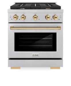 Luxury isn’t meant to be desired – it’s meant to be attainable. The ZLINE Autograph Edition 30 in. 4.2 cu. ft. Paramount Gas Range with 4 Burner Cooktop and Convection Gas Oven in DuraSnow® Stainless Steel and Polished Gold Accents (SGRSZ-30-G) features a versatile gas cooktop with 4 Italian-made auto-reignition burners, a high-performing gas convection oven, enhanced cast iron grates, a Horizon oven door window design, and elegant polished gold knobs and handle allowing you to master every meal. With a modern, timeless style and refined functionality, ZLINE Paramount Gas Ranges are masterfully crafted to deliver an elevated culinary experience.