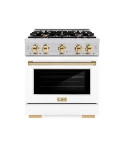 Luxury isn’t meant to be desired – it’s meant to be attainable. The ZLINE Autograph Edition 30 in. 4.2 cu. ft. Select Dual Fuel Range with 4 Burner Gas Cooktop and Electric Convection Oven in Stainless Steel with White Matte Door and Polished Gold Accents (HDRZ-WM-30-G) combines the elegance of a hand-finished porcelain gas cooktop with 4 Italian-made auto-reignition burners, an electric convection oven with an energy-efficient cooling fan to ensure quiet operation, a beautiful white matte door with a Horizon window design, and stunning polished gold knobs and handle allowing you to master every meal. With a modern, timeless style and refined functionality, ZLINE Select Dual Fuel Ranges are masterfully crafted to deliver an elevated culinary experience.