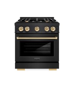 Luxury isn’t meant to be desired – it’s meant to be attainable. The ZLINE Autograph Edition 30 in. 4.2 cu. ft. Select Gas Range with 4 Burner Cooktop and Convection Gas Oven in Black Stainless Steel and Polished Gold Accents (HGRBZ-30-G) combines the elegance of a hand-finished porcelain gas cooktop with 4 Italian-made auto-reignition burners, a gas convection oven with an energy-efficient cooling fan to ensure quiet operation, a Horizon oven door window design, and stunning polished gold knobs and handle allowing you to master every meal. With a modern, timeless style and refined functionality, ZLINE Select Gas Ranges are masterfully crafted to deliver an elevated culinary experience.