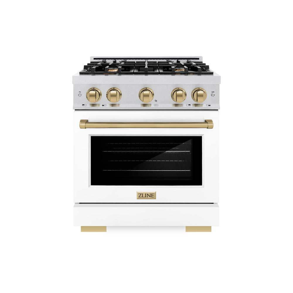 ZLINE Autograph Edition 30 in. 4.2 cu. ft. Select Gas Range with 4 Burner Cooktop and Convection Gas Oven in DuraSnow Stainless Steel with White Matte Door and Champagne Bronze Accents (HGRSZ-WM-30-CB)