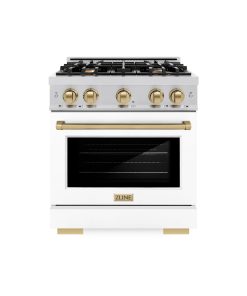 Luxury isn’t meant to be desired – it’s meant to be attainable. The ZLINE Autograph Edition 30 in. 4.2 cu. ft. Select Gas Range with 4 Burner Cooktop and Convection Gas Oven in Stainless Steel with White Matte Door and Champagne Bronze Accents (HGRZ-WM-30-CB) combines the elegance of a hand-finished porcelain gas cooktop with 4 Italian-made auto-reignition burners, a gas convection oven with an energy-efficient cooling fan to ensure quiet operation, a beautiful white matte door with a Horizon window design, and stunning champagne bronze knobs and handle allowing you to master every meal. With a modern, timeless style and refined functionality, ZLINE Select Gas Ranges are masterfully crafted to deliver an elevated culinary experience.