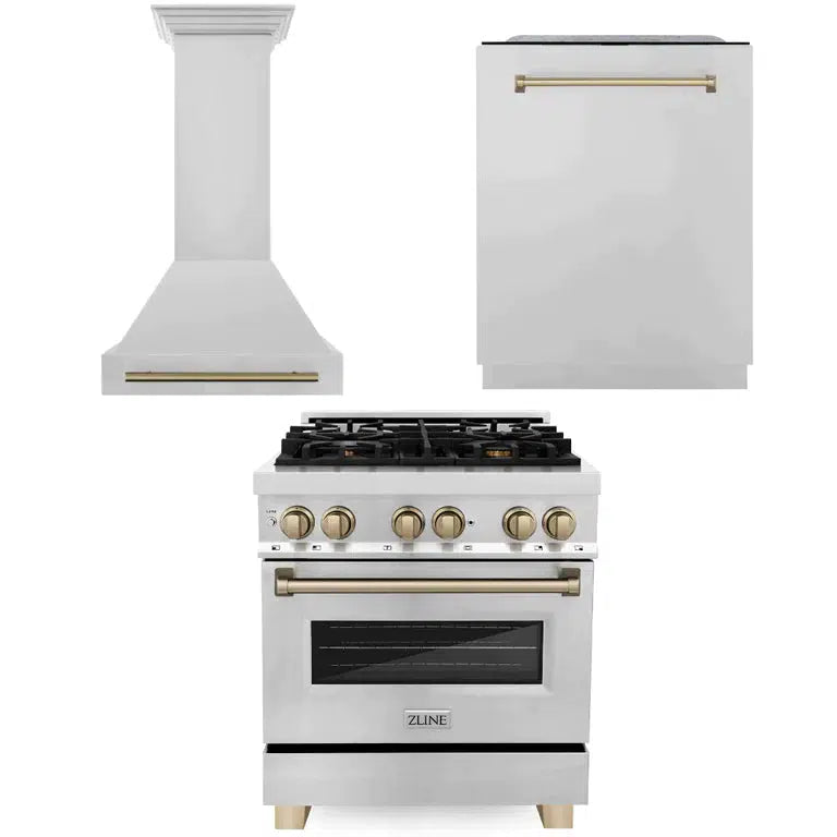 ZLINE Autograph Edition 30 in. Kitchen Package with Stainless Steel Dual Fuel Range and Range Hood with Champagne Bronze Accents (3AKP-RARHDWM30-CB)