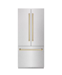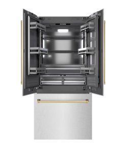 Luxury isn’t meant to be desired – it’s meant to be attainable. The ZLINE Autograph Edition 36 in. 19.6 cu. ft. French Door Built-In Bottom Freezer Refrigerator with Water Dispenser and Ice Maker in DuraSnow® Stainless Steel with Graphite Gray Interior and Polished Gold Accents (GRBIVZ-SN-36-G) provides the ultimate upgrade to the center of your home by pairing premium dual cooling technology with enhanced storage capacity for multiple grocery items. Achieve ZLINE Attainable Luxury® excellence with innovative features designed to enhance your kitchen’s cooling and freezing capability.