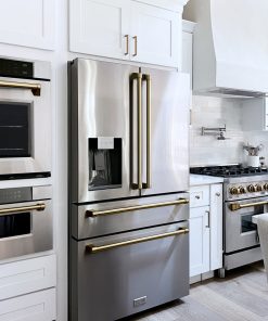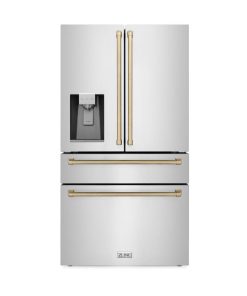 Luxury isn’t meant to be desired – it’s meant to be attainable. The ZLINE Autograph Edition 36 in. 21.6 cu. ft. Counter-Depth French Door Refrigerator with Water and Ice Dispenser in Fingerprint-Resistant Stainless Steel with Champagne Bronze Traditional Handles (RFMZ-W-36-CB) delivers an elevated experience by pairing innovative dual cooling technology with a spacious counter-depth design and an external water dispenser and ice maker. Achieve ZLINE Attainable Luxury® excellence with timeless features designed to enhance your kitchen’s capability.