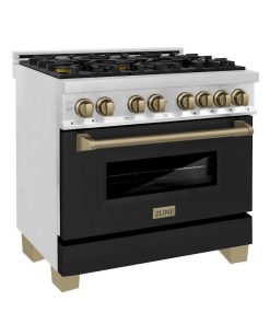 Luxury isn’t meant to be desired – it’s meant to be attainable. The ZLINE Autograph Edition 36 in. 4.6 cu. ft. Legacy Dual Fuel Range with 6 Burner Gas Cooktop and Electric Convection Oven in Stainless Steel with Black Matte Door and Champagne Bronze Accents (RAZ-BLM-36-CB) pairs a powerful gas cooktop with 6 Italian-crafted burners, an electric convection oven, a beautiful black matte door with a Landscape window design, and elegant champagne bronze knobs and handle. With innovative features designed to enhance your kitchen’s capability, ZLINE Legacy Dual Fuel Ranges provide a professional culinary experience by pairing unmatched performance with timeless style.