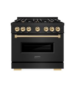 Luxury isn’t meant to be desired – it’s meant to be attainable. The ZLINE Autograph Edition 36 in. 5.2 cu. ft. Classic Dual Fuel Range with 6 Burner Gas Cooktop and Electric Convection Oven in Black Stainless Steel with Polished Gold Accents (CDRBZ-36-G) combines the elegance of a hand-finished porcelain gas cooktop with 6 Italian-made auto-reignition burners, an electric convection oven with an energy-efficient cooling fan to ensure quiet operation, a Landscape oven door window design, and stunning polished gold knobs and handle allowing you to master every meal. With a modern, timeless style and refined functionality, ZLINE Classic Dual Fuel Ranges are masterfully crafted to deliver an elevated culinary experience.