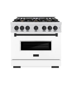 Luxury isn’t meant to be desired – it’s meant to be attainable. The ZLINE Autograph Edition 36 in. 5.2 cu. ft. Classic Dual Fuel Range with 6 Burner Gas Cooktop and Electric Convection Oven in DuraSnow® Stainless Steel with White Matte Door and Matte Black Accents (CDRSZ-WM-36-MB) combines the elegance of a hand-finished porcelain gas cooktop with 6 Italian-made auto-reignition burners, an electric convection oven with an energy-efficient cooling fan to ensure quiet operation, a beautiful white matte door with a Landscape window design, and stunning matte black knobs and handle allowing you to master every meal. With a modern, timeless style and refined functionality, ZLINE Classic Dual Fuel Ranges are masterfully crafted to deliver an elevated culinary experience.