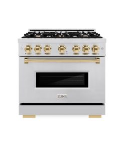 Luxury isn’t meant to be desired – it’s meant to be attainable. The ZLINE Autograph Edition 36 in. 5.2 cu. ft. Classic Dual Fuel Range with 6 Burner Gas Cooktop and Electric Convection Oven in Stainless Steel with Polished Gold Accents (CDRZ-36-G) combines the elegance of a hand-finished porcelain gas cooktop with 6 Italian-made auto-reignition burners, an electric convection oven with an energy-efficient cooling fan to ensure quiet operation, a Landscape oven door window design, and stunning polished gold knobs and handle allowing you to master every meal. With a modern, timeless style and refined functionality, ZLINE Classic Dual Fuel Ranges are masterfully crafted to deliver an elevated culinary experience.