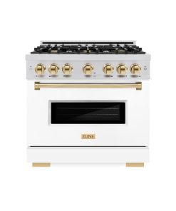 Luxury isn’t meant to be desired – it’s meant to be attainable. The ZLINE Autograph Edition 36 in. 5.2 cu. ft. Classic Gas Range with 6 Burner Cooktop and Convection Gas Oven in Stainless Steel with White Matte Door and Polished Gold Accents (CGRZ-WM-36-G) combines the elegance of a hand-finished porcelain gas cooktop with 6 Italian-made auto-reignition burners, a gas convection oven with an energy-efficient cooling fan to ensure quiet operation, a beautiful white matte door with a Landscape window design, and stunning polished gold knobs and handle allowing you to master every meal. With a modern, timeless style and refined functionality, ZLINE Classic Gas Ranges are masterfully crafted to deliver an elevated culinary experience.