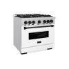 ZLINE Autograph Edition 36 in. 5.2 cu. ft. Classic Gas Range with 6 Burner Cooktop and Convection Gas Oven in Stainless Steel with White Matte Door and Polished Gold Accents (CGRZ-WM-36-G)