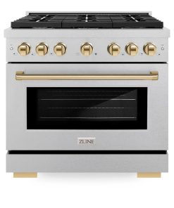 ZLINE Autograph Edition 36 in. 5.2 cu. ft. Paramount Gas Range with 6 Burner Cooktop and Convection Gas Oven in DuraSnow Stainless Steel and Polished Gold Accents (SGRSZ-36-G)