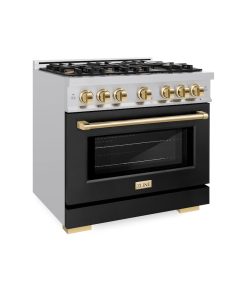 ZLINE Autograph Edition 36 in. 5.2 cu. ft. Select Dual Fuel Range with 6 Burner Gas Cooktop and Electric Convection Oven in Stainless Steel with Black Matte Door and Polished Gold Accents (HDRZ-BLM-36-G)