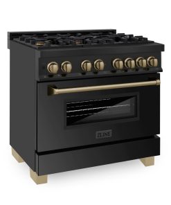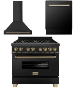 ZLINE Autograph Edition 36 in. Kitchen Package with Black Stainless Steel Dual Fuel Range, Range Hood and Dishwasher with Champagne Bronze Accents (3AKP-RABRHDWV36-CB)