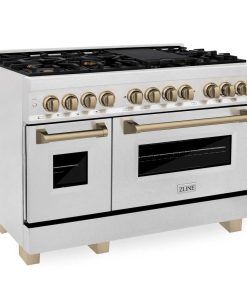 Luxury isn’t meant to be desired – it’s meant to be attainable. The ZLINE Autograph Edition 48 in. 6.0 cu. ft. Legacy Dual Fuel Range with 7 Burner Gas Cooktop and 2 Electric Ovens in DuraSnow® Stainless Steel and Champagne Bronze Accents (RASZ-SN-48-CB) pairs a powerful gas cooktop with 7 Italian-crafted burners, a large electric convection oven, a small bake and broil oven, Landscape oven door window designs, and elegant champagne bronze knobs and handles. With innovative features designed to enhance your kitchen’s capability, ZLINE Legacy Dual Fuel Ranges provide a professional culinary experience by pairing unmatched performance with timeless style.