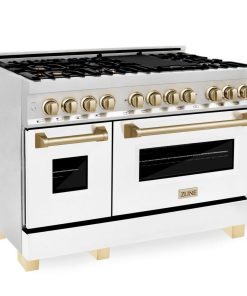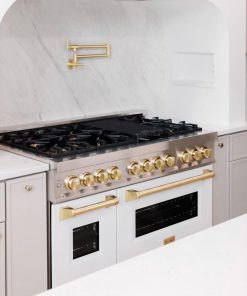 Luxury isn’t meant to be desired – it’s meant to be attainable. The ZLINE Autograph Edition 48 in. 6.0 cu. ft. Legacy Dual Fuel Range with 7 Burner Gas Cooktop and 2 Electric Ovens in Stainless Steel with White Matte Doors and Polished Gold Accents (RAZ-WM-48-G) pairs a powerful gas cooktop with 7 Italian-crafted burners, a large electric convection oven, a small bake and broil oven, beautiful white matte doors with Landscape window designs, and elegant polished gold knobs and handles. With innovative features designed to enhance your kitchen’s capability, ZLINE Legacy Dual Fuel Ranges provide a professional culinary experience by pairing unmatched performance with timeless style.