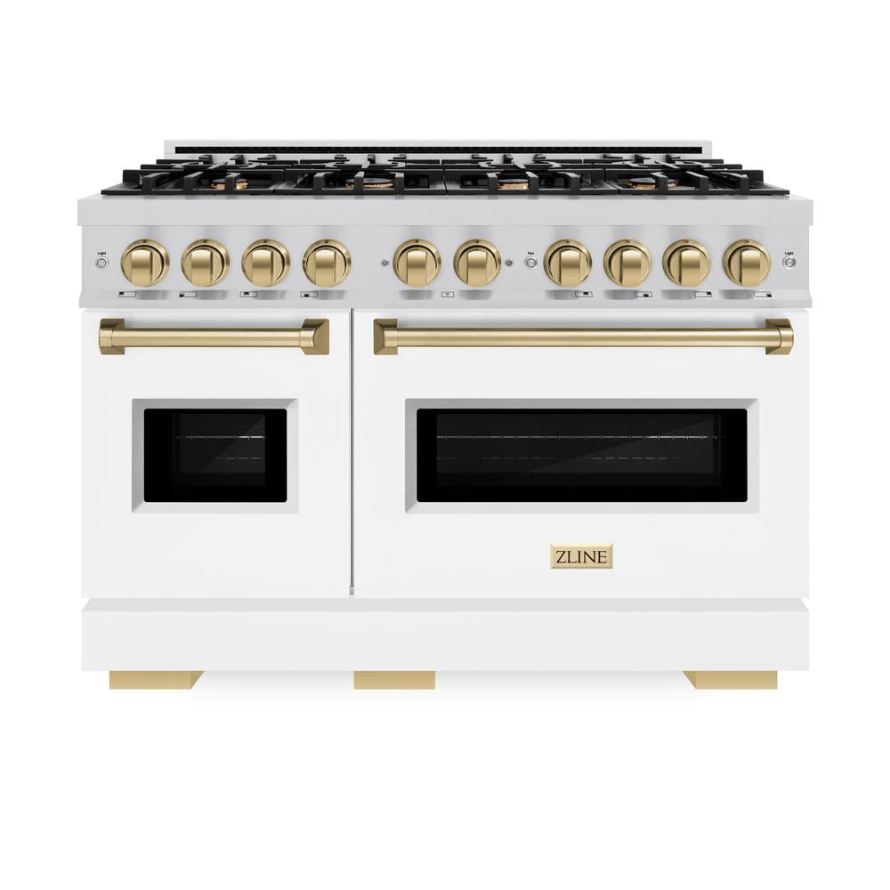 ZLINE Autograph Edition 48 in. 6.7 cu. ft. Classic Double Oven Dual Fuel Range with 8 Burner Gas Cooktop in Stainless Steel with White Matte Doors and Champagne Bronze Accents (CDRZ-WM-48-CB)
