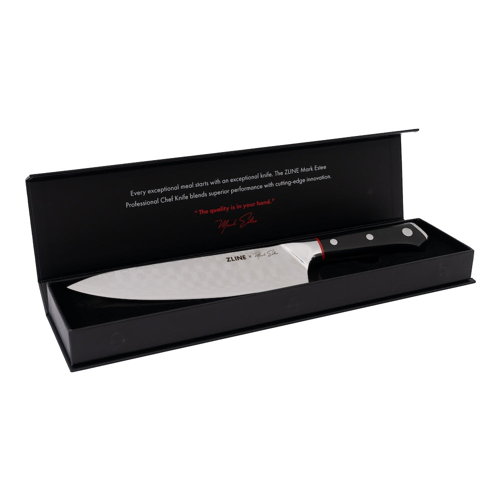 Luxury isn’t meant to be desired – it’s meant to be attainable. The ZLINE Mark Estee 8 in. Professional Japanese Damascus Steel Chef Knife (KCKT-ME-JD) provides a professional culinary experience by pairing quality precision with a bold, signature style championed by renowned chef Mark Estee. Achieve ZLINE Attainable Luxury® excellence with a cutting-edge ergonomic knife design engineered to inspire your inner chef.