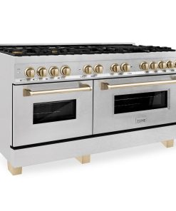 ZLINE Autograph Edition 60 in. 7.4 cu. ft. Legacy Dual Fuel Range with 9 Burner Gas Cooktop and 2 Electric Convection Ovens in DuraSnow Stainless Steel and Polished Gold Accents (RASZ-SN-60-G)